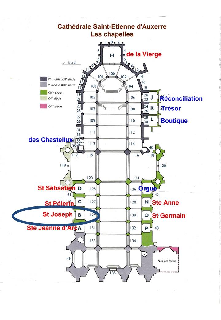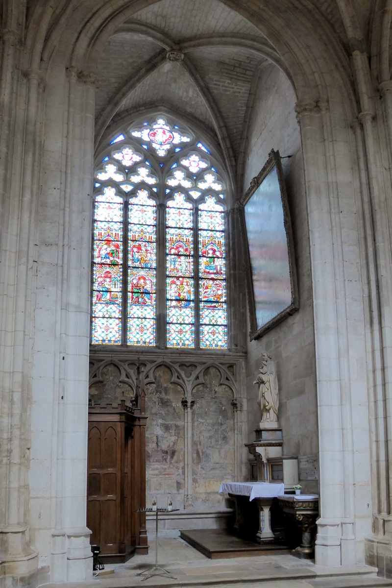 - Vitrail de la vie de saint Joseph (fin XIXe siècle) en 8 panneaux : en bas l’adoration des mages (3ème à partir de la gauche), en haut la « fuite en Égypte » (1er à gauche)