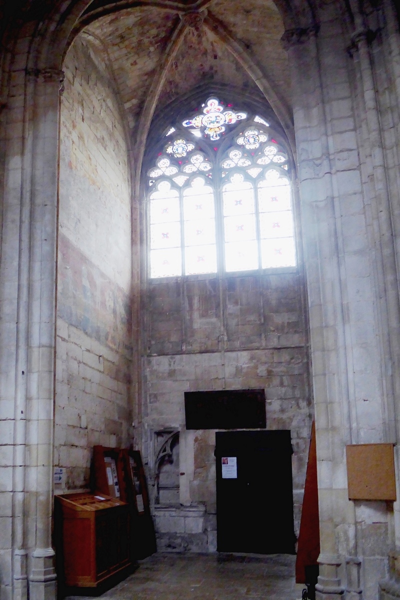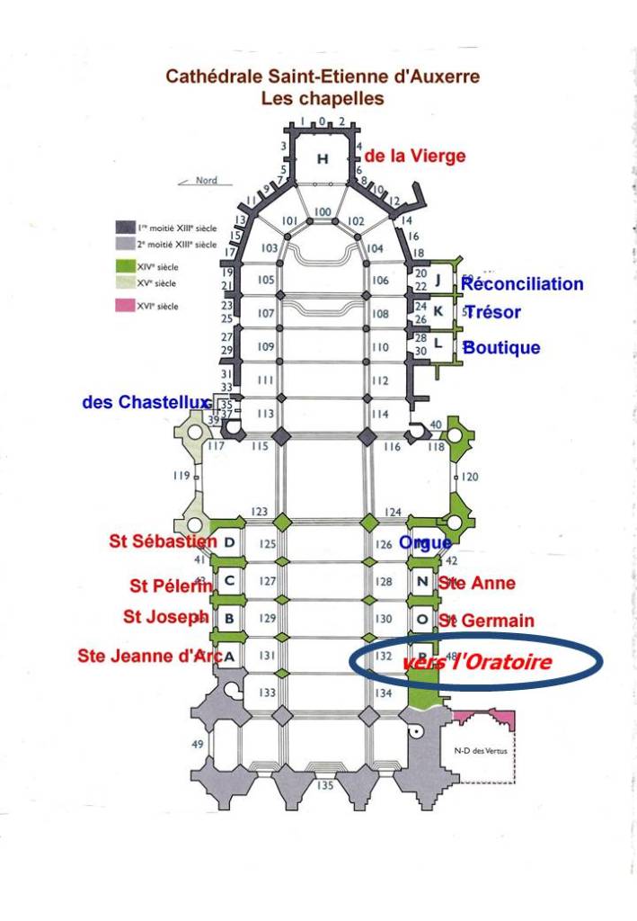 - au-dessus de la porte de l’oratoire : plaque en bois commémorant la restauration du chœur de la cathédrale par l’évêque Jacques Amyot après la prise d’Auxerre par les huguenots (protestants calvinistes opposés à la Ligue catholique en 1567)
