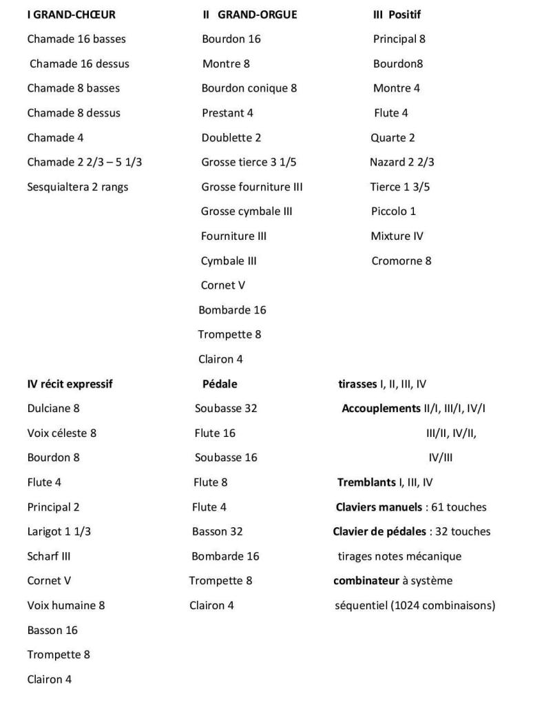 Les jeux d’anches, les trois Cornets le Cromorne et la Voix humaine nous permettent d’apprécier les joyaux de la musique française des 17ème, 18ème et post classiques, sans oublier les 19 rangs de plein-jeux qui, selon le choix judicieux que l’on peut en faire, servent aussi bien un « Grand Plein-jeu » de Guillaume Nivers, Nicolas de Grigny ou Louis Marchand.