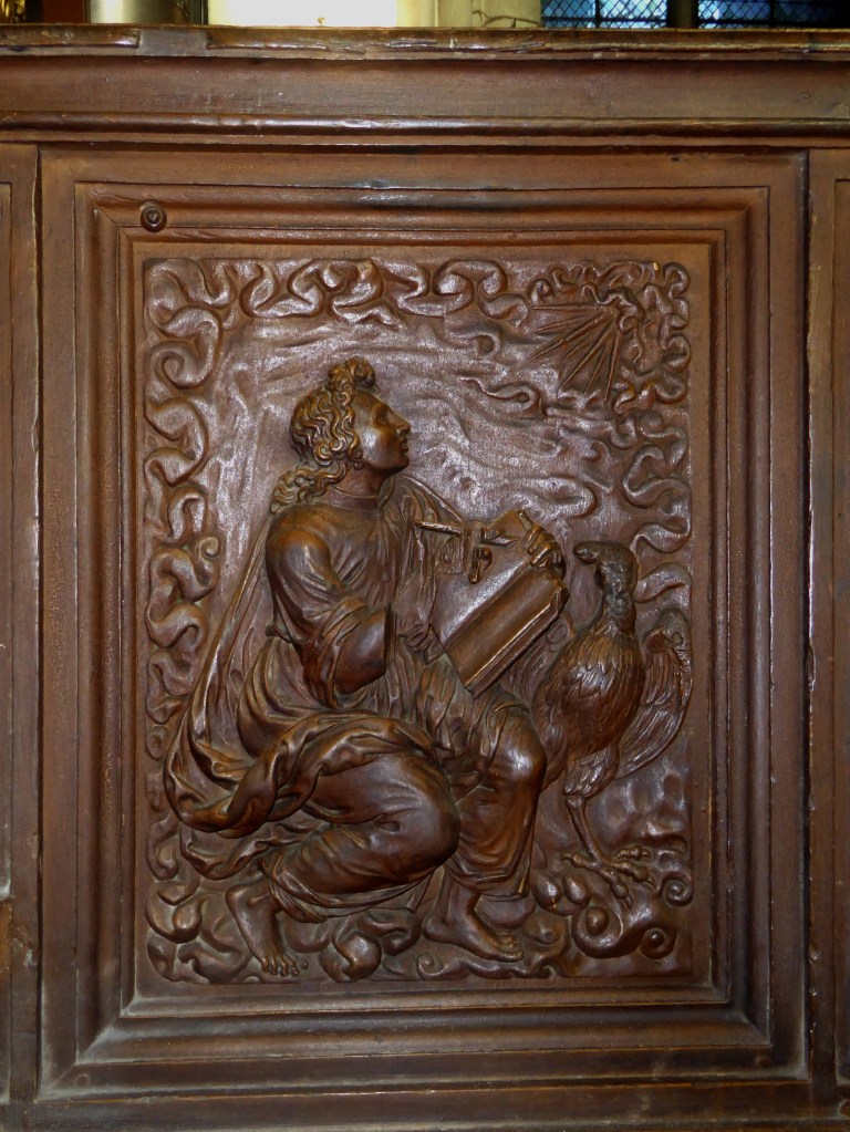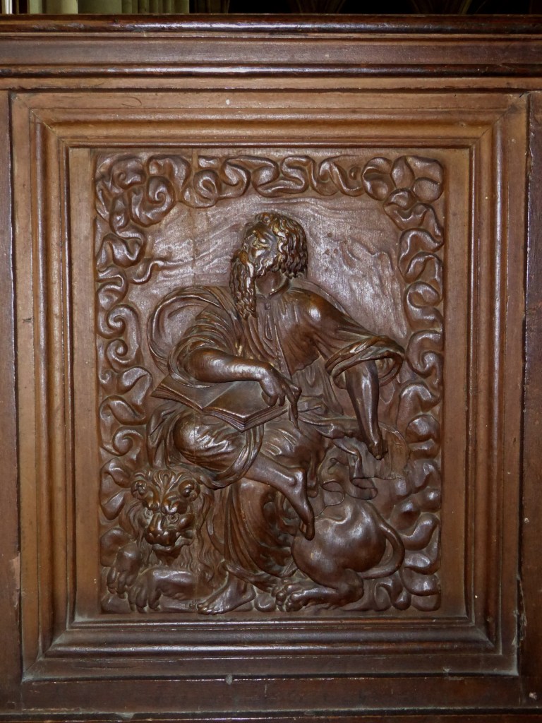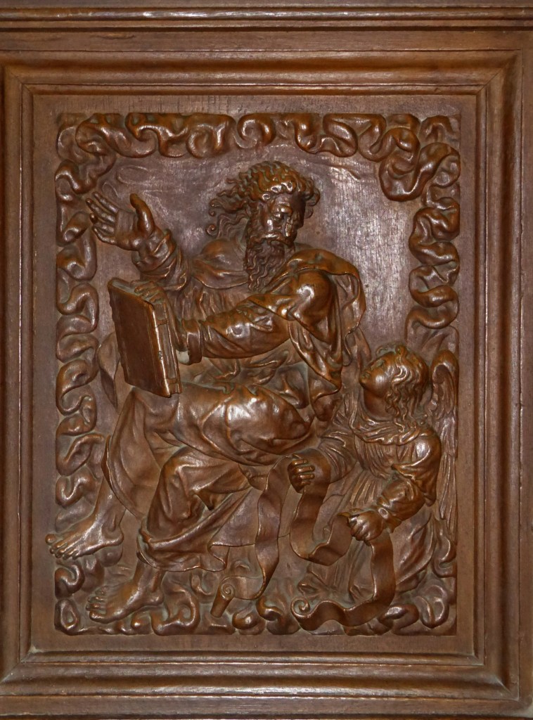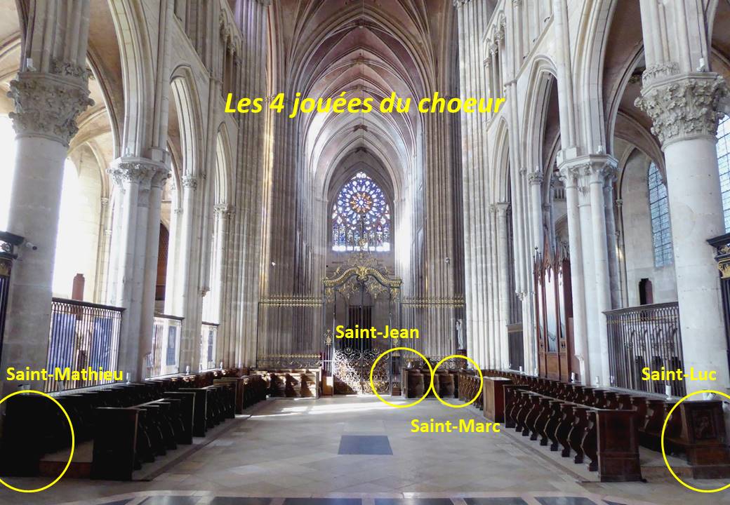 À l’extrémité des stalles, se situent les « jouées », panneaux souvent ornementés : elles représentent les quatre Évangélistes